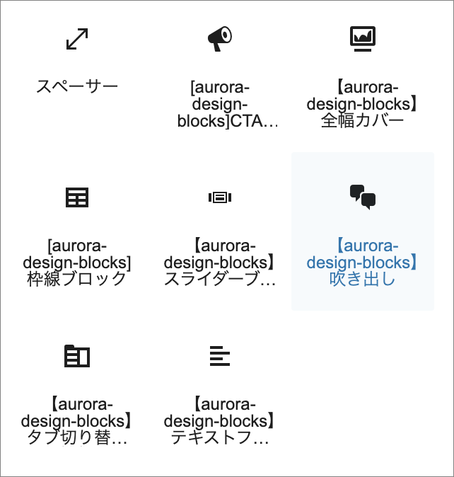 ブロック追加ボタンから「[aurora-design-blocks] 吹き出し」を選びます。