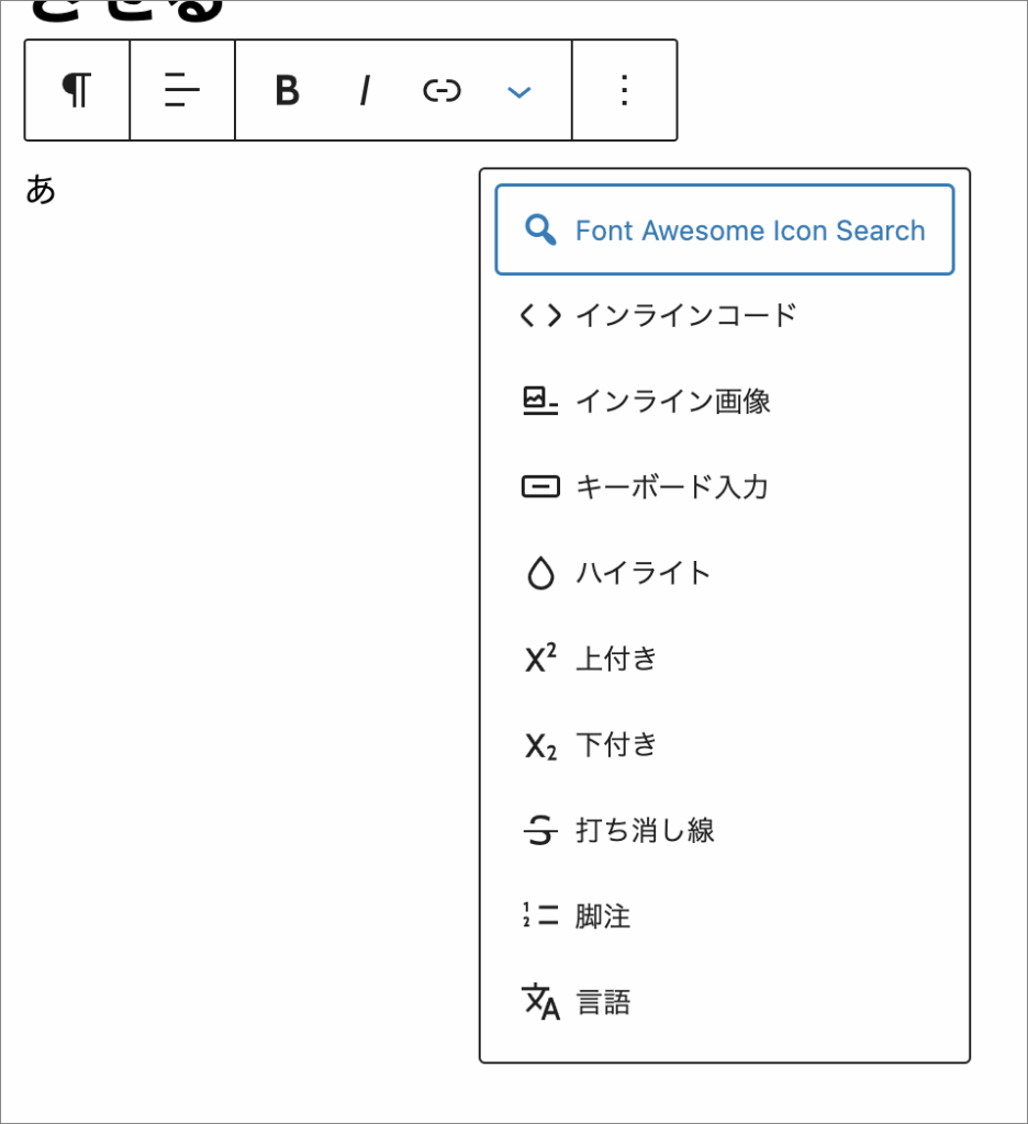 まず、ブロック内のメニューから「▼」をクリックし、Font Awesome Icon Search を選びます。