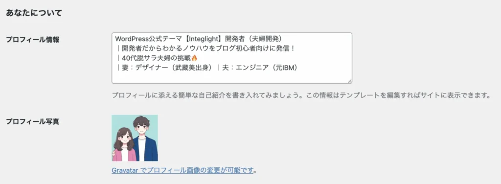 設定が完了すると、WordPress管理画面の「ユーザー > プロフィール」画面にGravatar画像が表示されます。