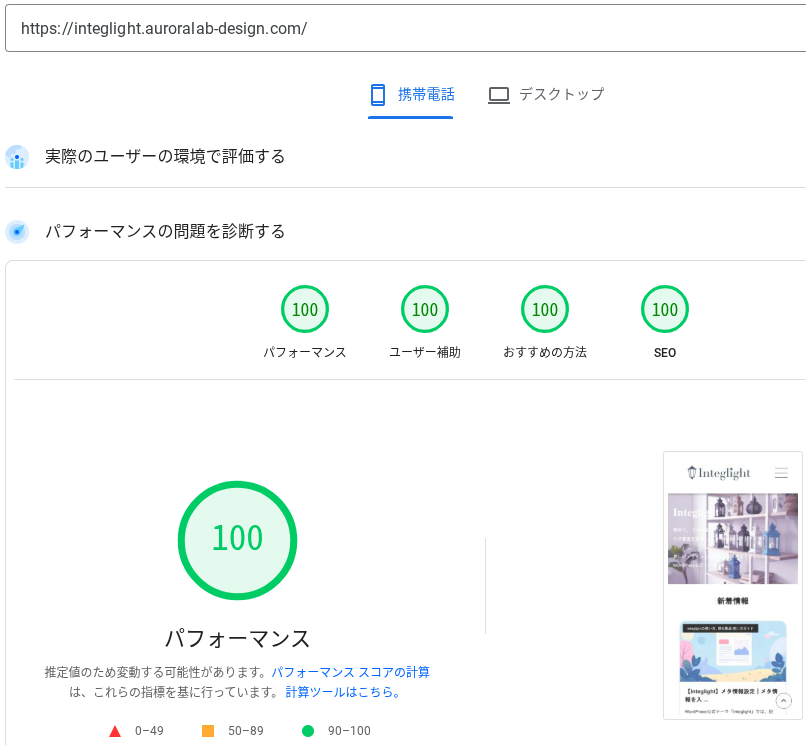 The following are the results of PageSpeed Insights, a website evaluation tool. This value is also evaluated by Google and is directly linked to SEO. In particular, the performance (website speed) has received a high score.