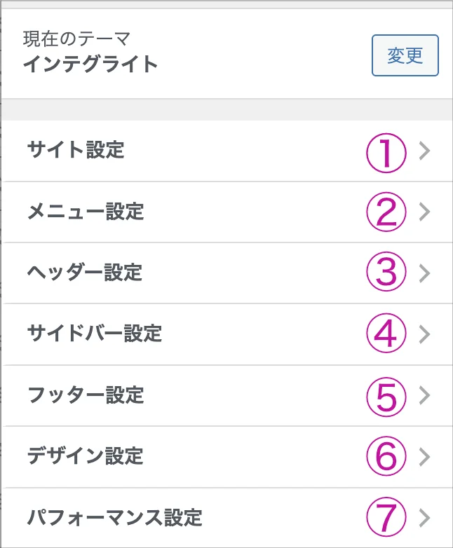 | 7 | パフォーマンス設定 | キャッシュや読み込み最適化など、表示速度に関する設定です(テーマ依存)。 |