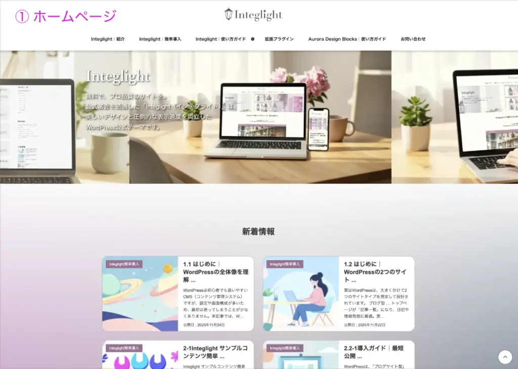 | 1 | ホームページ | サイトのトップページです。最新投稿や固定ページを表示できます。 |