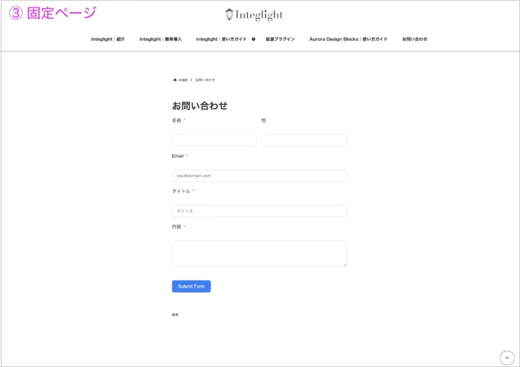 | 3 | 固定ページ | 「会社概要」「お問い合わせ」など更新頻度の低いページを作成します。 |