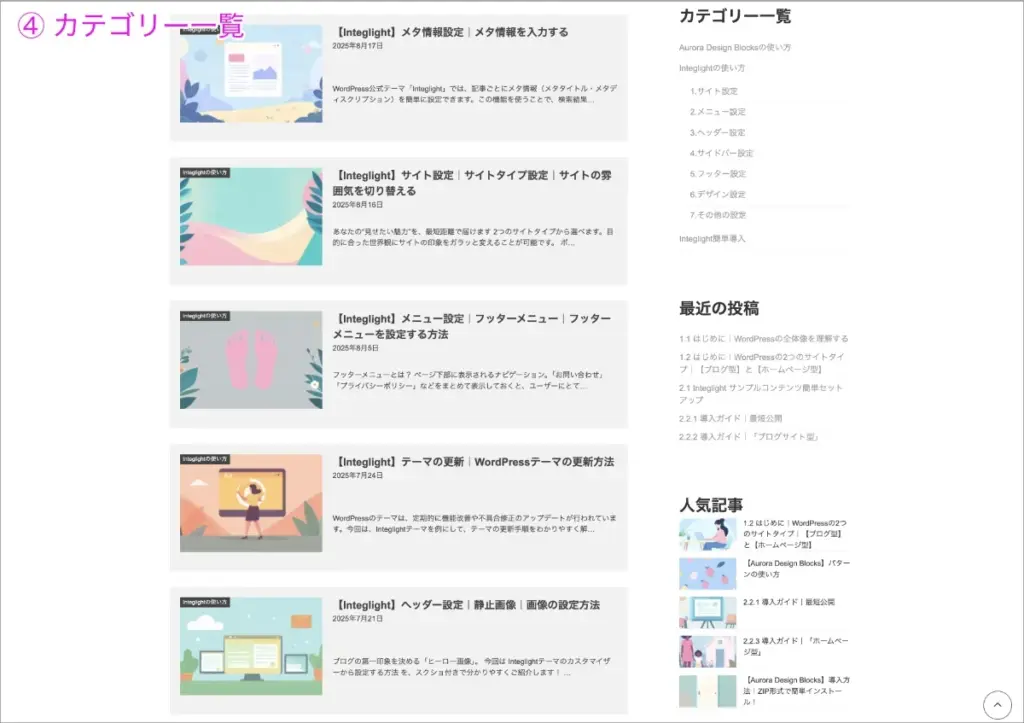 | 4 | カテゴリー一覧 | 投稿をカテゴリごとに整理し、一覧で表示できるページです。 |