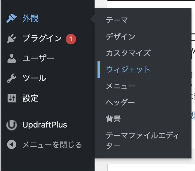 左メニューから「外観」→「ウィジェット」を選択します。